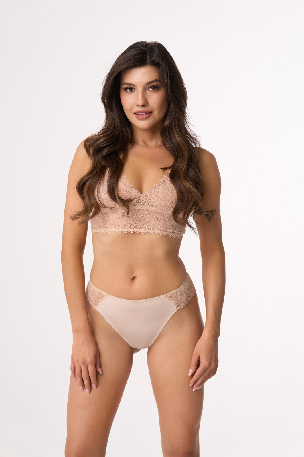 Beżowe klasyczne figi z koronką. Wykonane zostały w 92% z bawełny i tylko 8% elastanu. Dzięki ich kroju są wygodne i funkcjonalne. Odkrywają pośladki. Wykończone zostały delikatną tasiemką, która dodaje nie mało klasy do całej stylizacji. Tył cały z koronki.