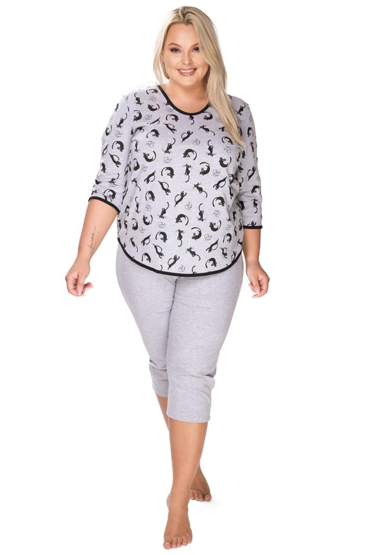 - Wygodna,dwuczęściowa piżama damska z zabawnym wzorem w kotki. Piżama z koszulką z rękawkiem 3/4 i ze spodniami typu rybaczki.