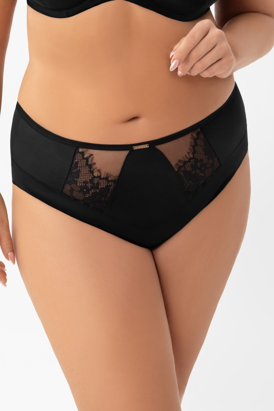 - Wyższy stan. Zabudowany fason zasłaniający prawie całe pośladki. Wykonane z kryjącej microfibry z koronkowymi elementami na tiulu stabilnym. Tył wykończony poprzez podwinięcie krawędzi microfibry na płasko. Bawełniany kroczek.