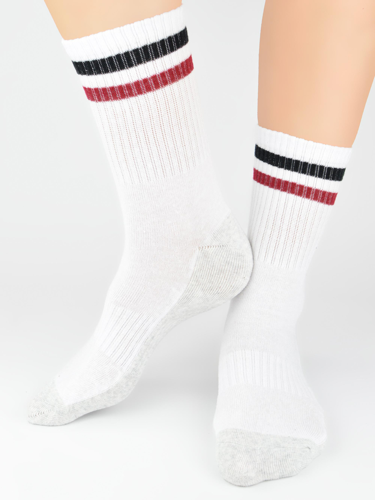 - Wygodne skarpetki z frotty. Skarpetki dla kobiet i mężczyzn, ze sportowym dodatkiem pasków. Dobrze odprowadzają wilgoć.
