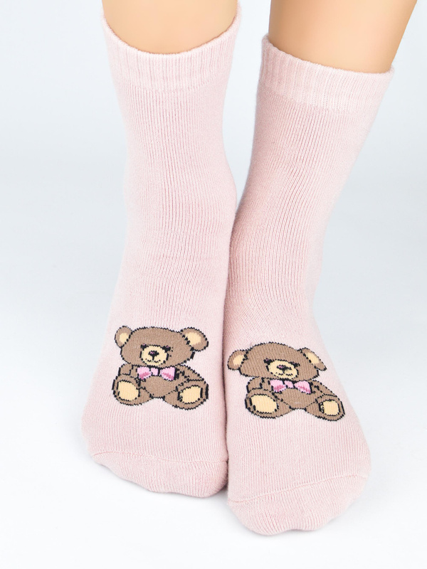 Różowe skarpetki damskie frotte z misiem SF029 pudrowy róż - Noviti