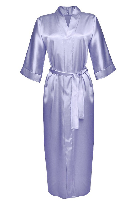 - Elegancka satynowa podomka, wiązana w pasie satynowym paskiem. Rękawki kimonowe, długość do łydki.