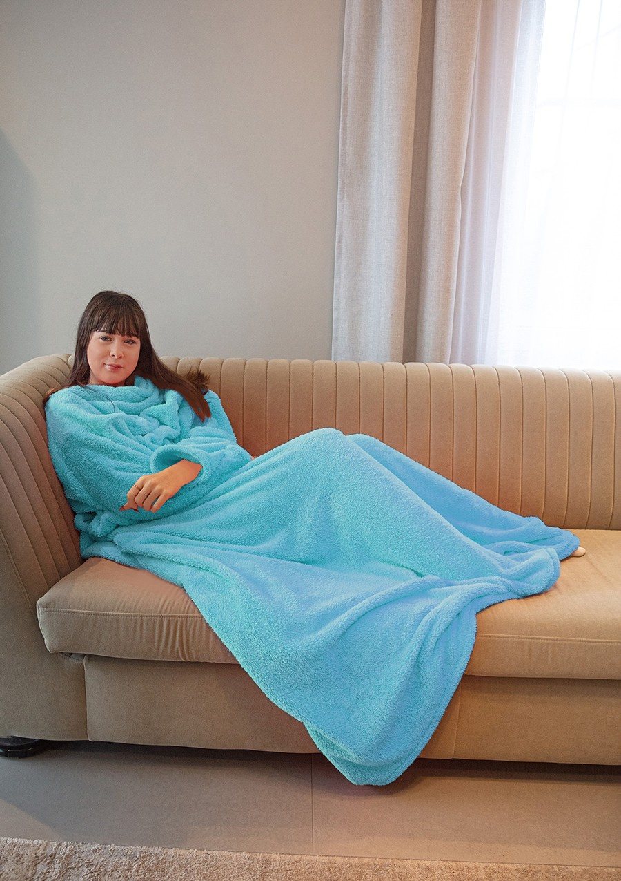 Koc z rękawami - Puch Turkus sprawdzi się w chłodne zimowe wieczory, jak i w przytulnych, letnich nocach. To doskonały towarzysz podczas oglądania ulubionych filmów, czytania książek czy po prostu relaksu przy kominku. Przytulny i funkcjonalny – stwórz swoje własne małe spa w domowym zaciszu.