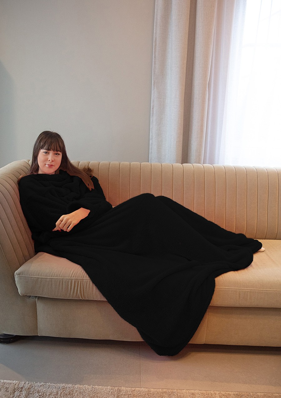Nie czekaj! Wzbogać swoją garderobę o koc z rękawami - Puch Czarny i ciesz się komfortem oraz elegancją na co dzień!