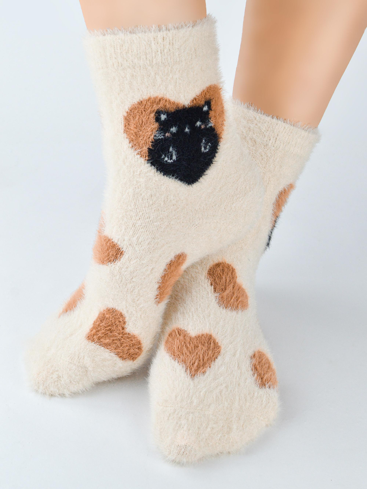 Puchate Skarpetki z kotkiem i serduszkami SP020 beż- Noviti