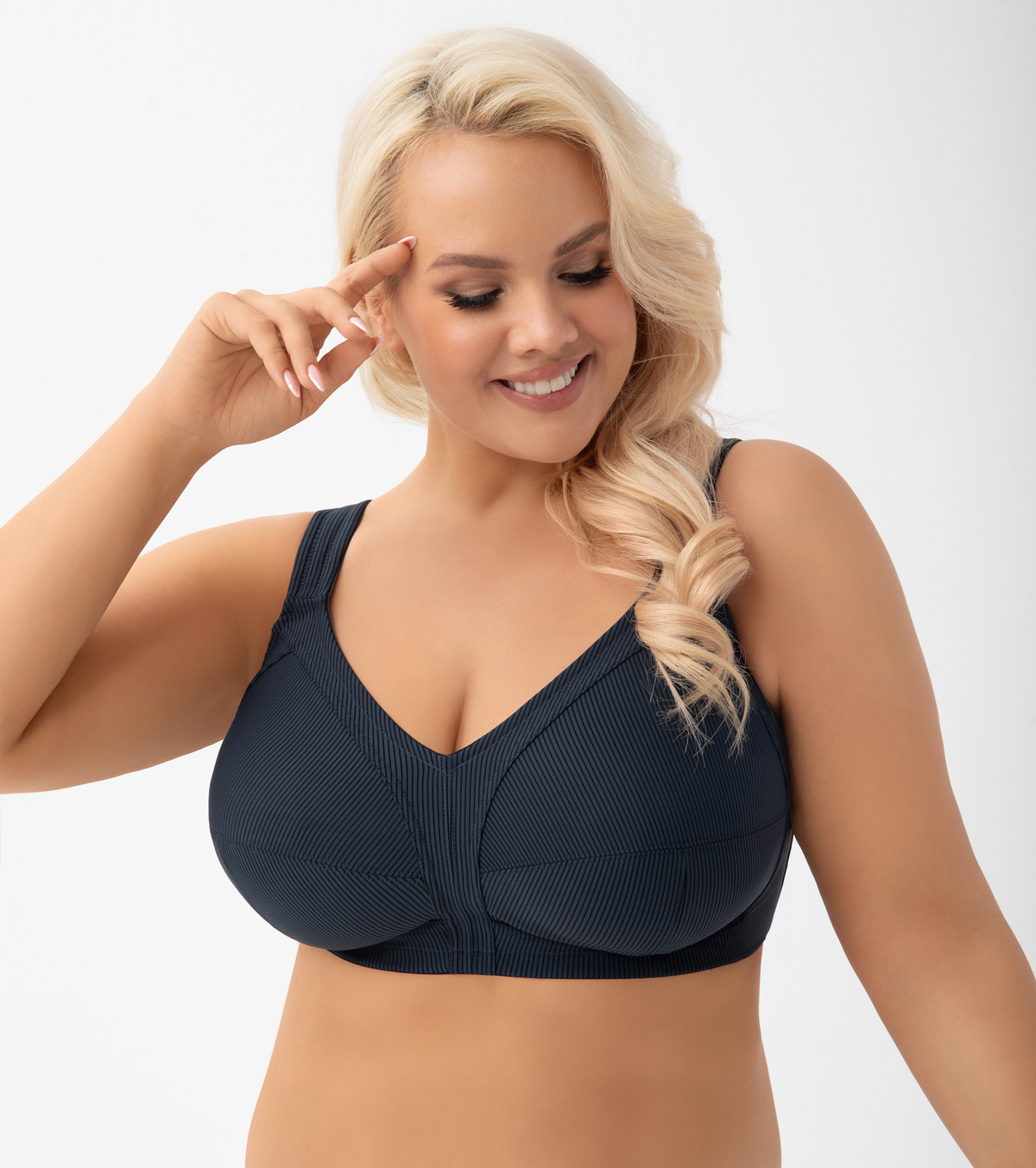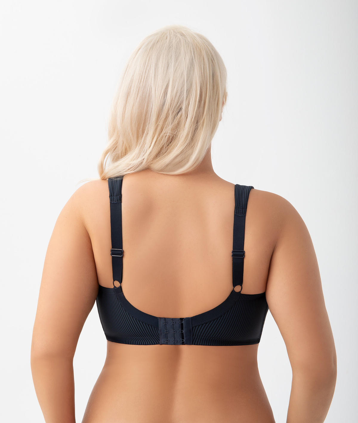 Bardzo wygodny miękki biustonosz dedykowany kobietom z dużym biustem. Stabilnie i pewnie obejmuje biust, nie uciskając, a szerokie wygodne ramiączka pozwalają odpocząć kręgosłupowi. Polecany też w trakcie aktywności sportowej, bo zapewnia stabilne podtrzymanie , a dzięki elastycznej tkaninie pięknie dopasowuje się do ciała. Miękki biustonosz bez fiszbin , w pięknym granatowym kolorze.
