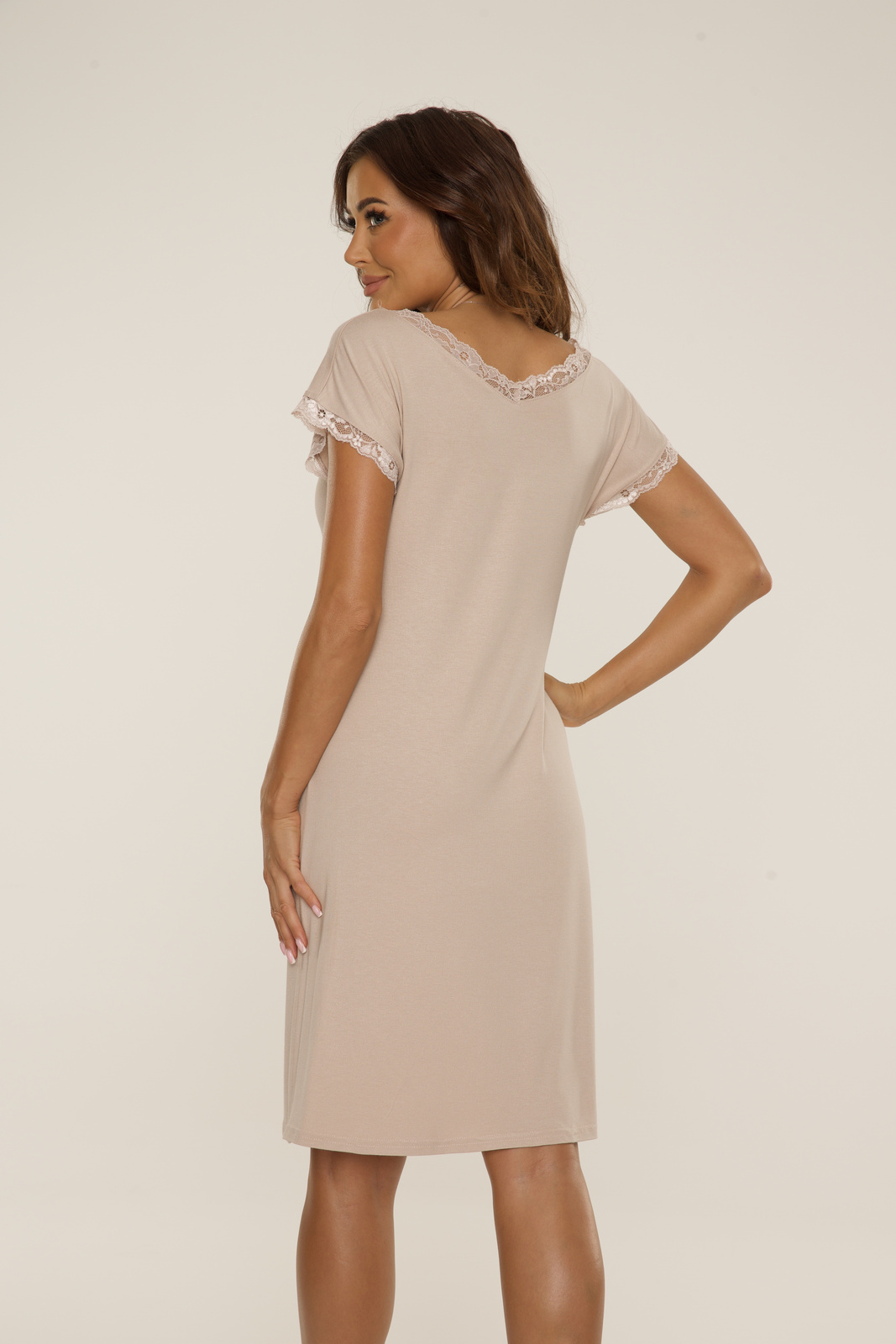Wyjątkowe cechy tego modelu to przede wszystkim gładki materiał oraz krótki rękaw, które sprawiają, że koszula idealnie sprawdzi się zarówno w ciepłe noce, jak i podczas leniwych poranków. Stylowy dekolt w kształcie szpica dodaje całości niepowtarzalnego charakteru, podkreślając kobiecą sylwetkę i dodając jej subtelności.