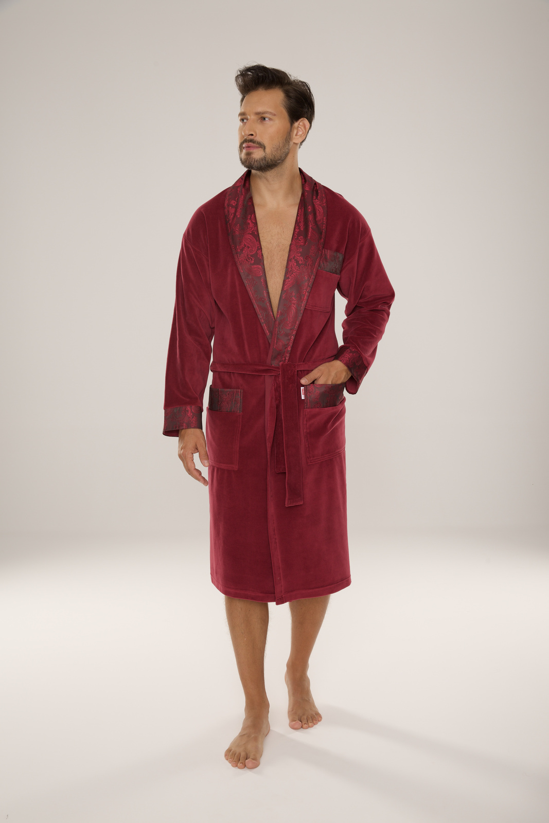 - Bawełniany szlafrok męski De Lafense 868. Długi, z szalowym kołnierzem, wiązany na pasek, z dwoma naszytymi kieszeniami i jedną mniejszą na wysokości klatki piersiowej. Mankiety, kołnierz i kieszenie wykończone wzorzystą satyną. Bardzo wygodny i elegancki