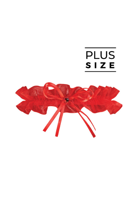 Czerwona, przyciągająca wzrok podwiązka z delikatnej warstwy marszczonego tiulu. Jej środek zdobi subtelna kokardka ton w ton i kryształowe oczko. Aby zapobiec zsuwaniu, podwiązke zaopatrzono w warstwę silikonu..