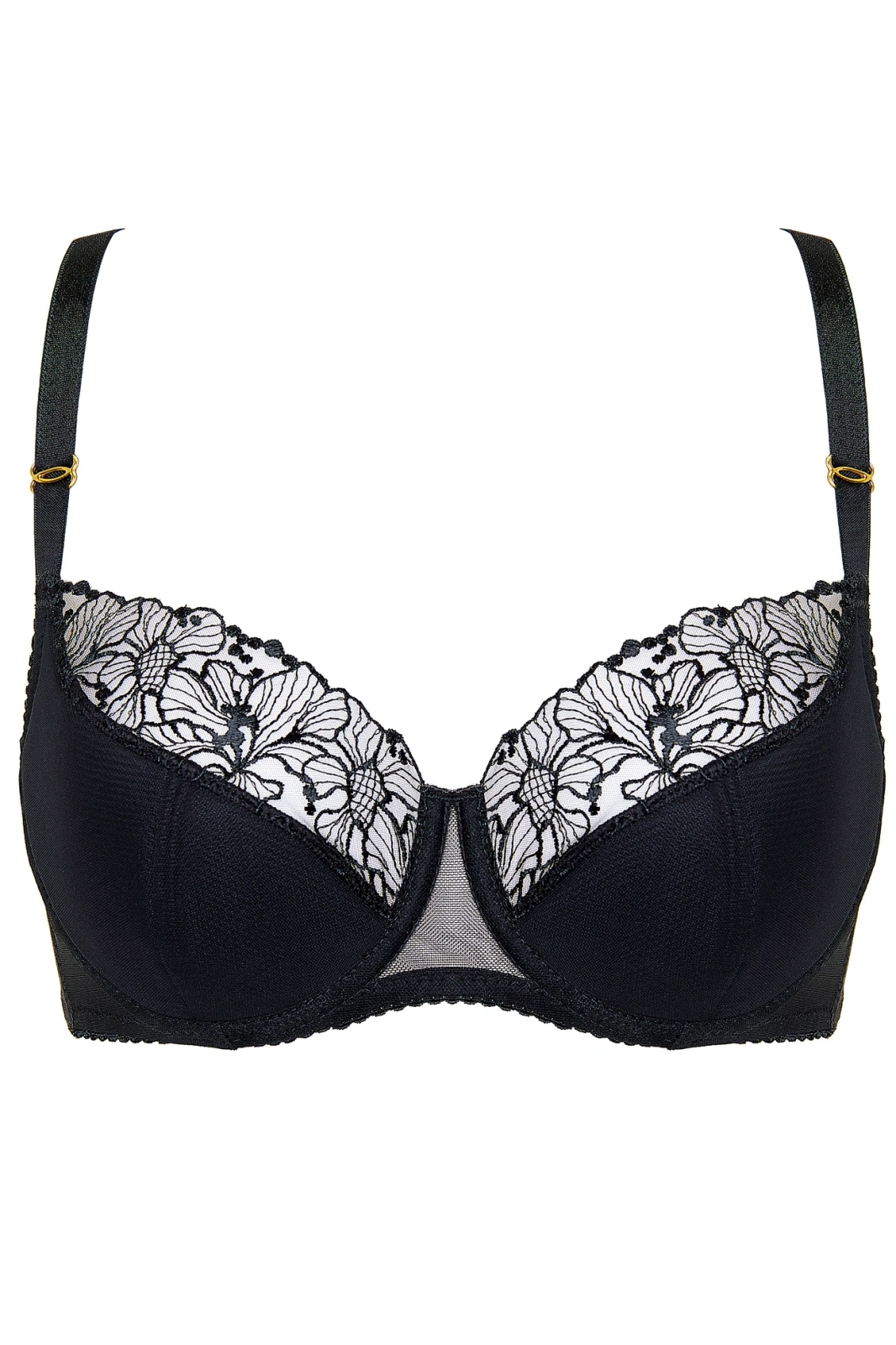 Dolna część misek wykonana z cienkiej pianki gorseciarskiej obszytej tiulem, a górna z ozdobnego haftu, dzięki czemu biustonosz doskonale dopasowuje się do kształtu piersi, Dolną część misek pokryto od wewnątrz przyjazną dla skóry bawełną ze standardem OEKO-TEX®, Złote detale dodają biustonoszowi elegancji, Pionowe fiszbiny boczne stabilizują obwód biustonosza, Tył biustonosza uszyty z tiulu, Biustonosz zaprojektowano i uszyto w Polsce, W celu utrzymania bielizny w dobrej kondycji przez długi czas zaleca się delikatne pranie ręczne w temperaturze 30°C, Modelka ma 180 cm wzrostu i nosi rozmiar 70E.Szczegółowe dane