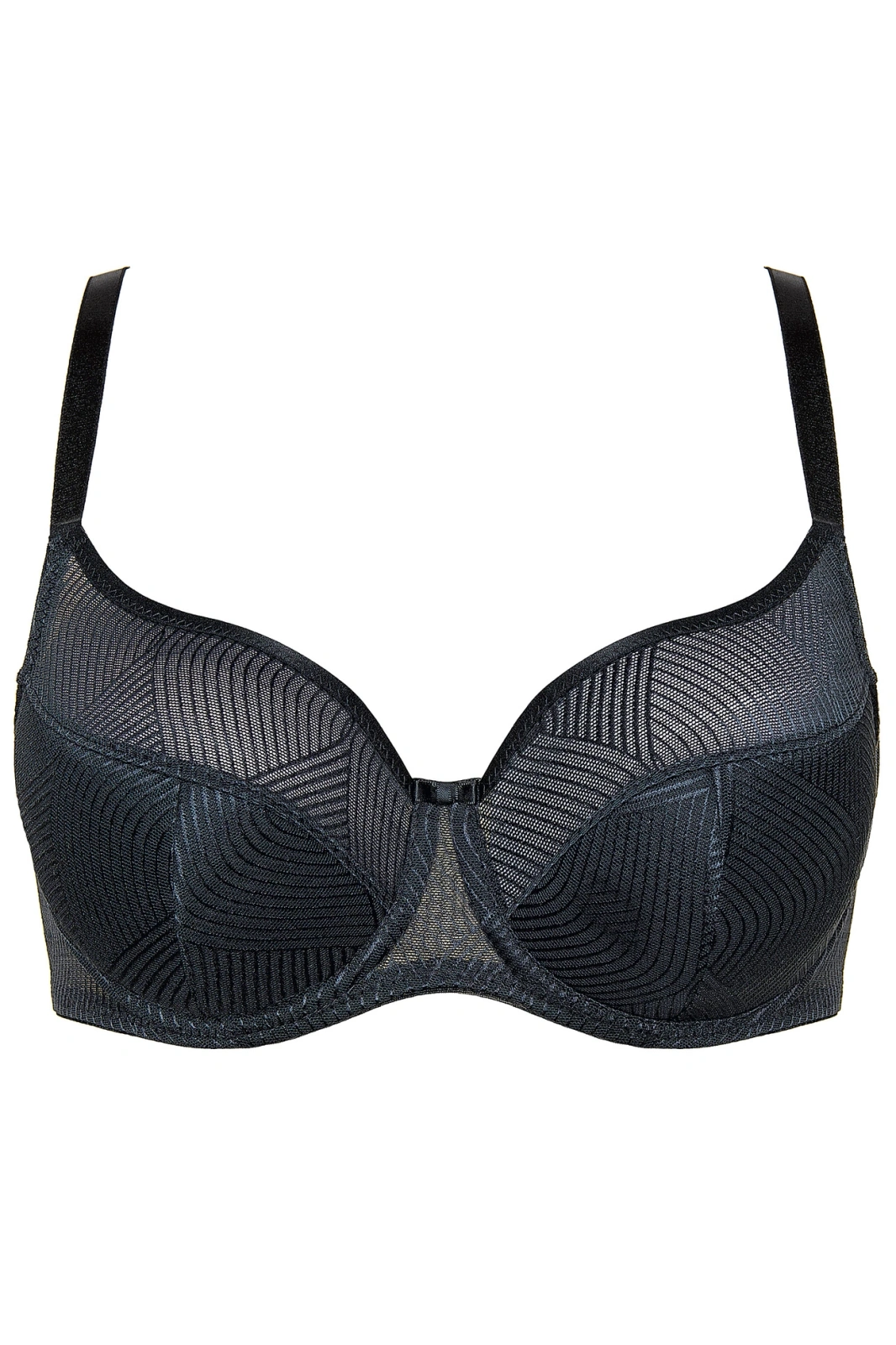 - Czarny biustonosz półusztywniany z geometrycznym wzorem marki Gorteks. Dzięki materiałom z których został obszyty- idealnie dopasowuje się do kształtu piersi niwelując asymetrie.